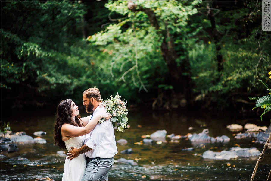 My friend and fellow photographer got married last weekend! Sarah & Kyle asked me to take a few bride & groom portraits for them, and I'm so glad for the opportunity! After a 10-minute hike through the woods and crossing a narrow rope bridge, we arrived at the gorgeous setting. The weather and lighting were dreamy. It was a nice change being able to enjoy most of the wedding as a guest, but still be able to photograph part of a unique event. They wanted to for a natural, romantic feel and I hope I captured that for them. Here are a few of my favorites!